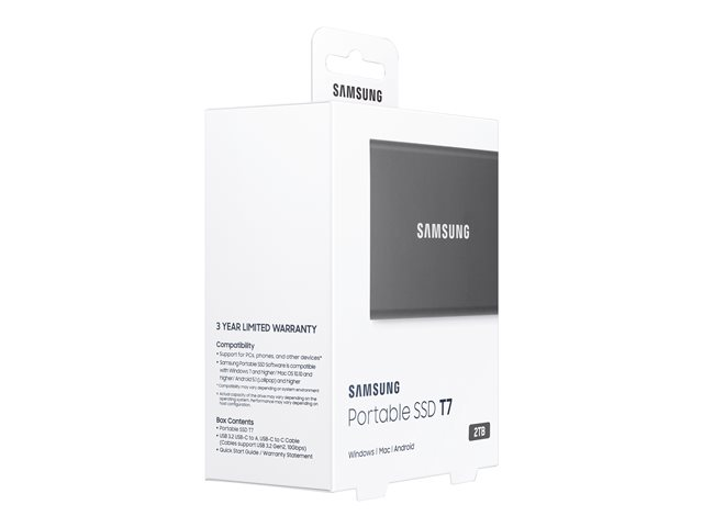 Samsung T7 MU-PC2T0T - SSD - salattu - 2 Tt - ulkoinen (kannettava) - USB 3.2 Gen 2 (USB-C liitin) - AES 256 bittiä - titaanin harmaa MU-PC2T0T/WW