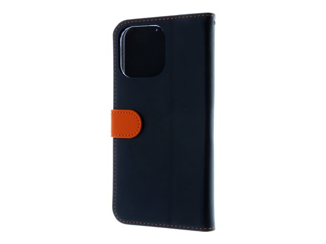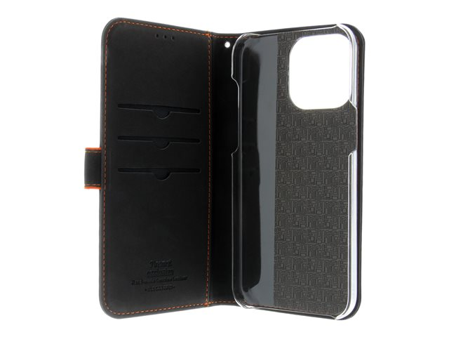 Insmat Exclusive - Läppäkansi matkapuhelimelle - aito nahka, polykarbonaatti, kartonki + paperi + alumiinifolio, puuvillaompeleet - musta/oranssi malleihin Apple iPhone 15 Pro Max 650-3195